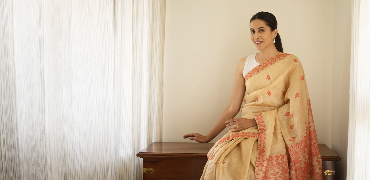 Yellow Brown Tussar Silk Eco Print and Hand Paint