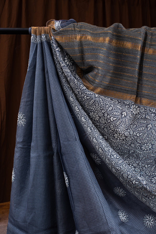 Steel Grey Tussar Silk Chikankari