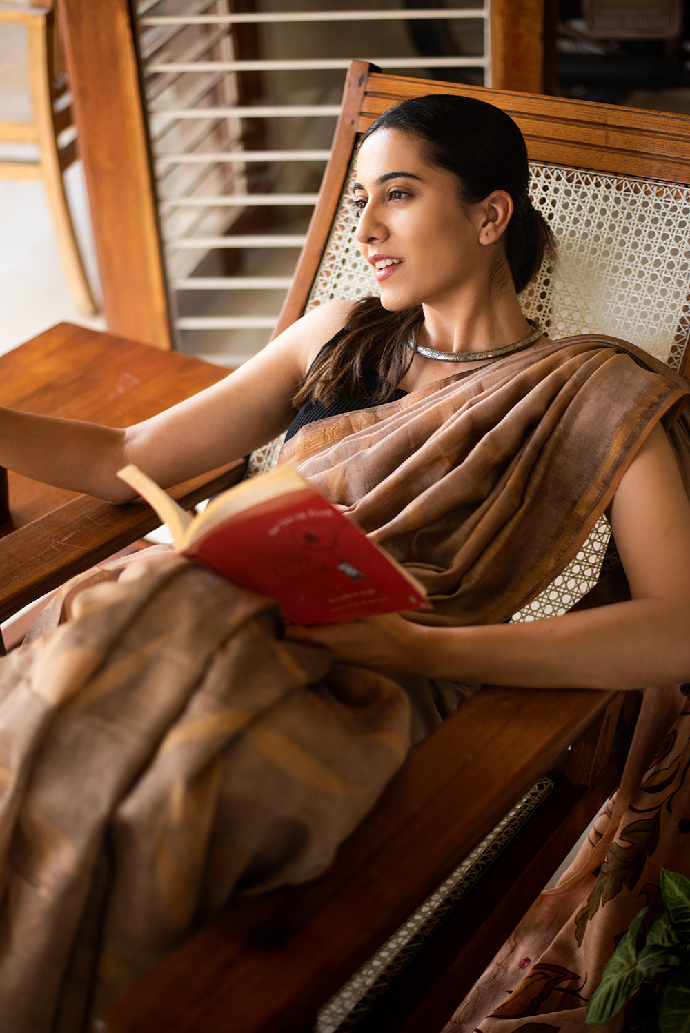 The mulberry silk glides across the skin with an effortless elegance, catching light without ever demanding it. Imbued with plant-based impressions and accentuated by the textured rhythm of kantha threads, this saree is less a garment and more a living archive, a diary of nature, preserved in fabric.